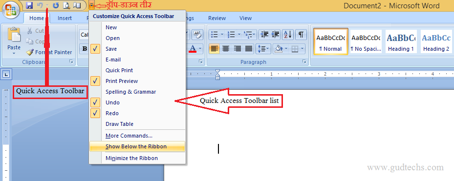 जब आप Quick Access Toolbar के बगल में ड्रॉप-डाउन तीर पर क्लिक करते हैं तो यह सभी commands का सुची प्रदान करता है। बाएं क्लिक के साथ आप इनमें से कोई भी command को Quick Access Toolbar में जोड़ सकते हैं तथा जोड़े गए command को भी हटा सकते हैं।