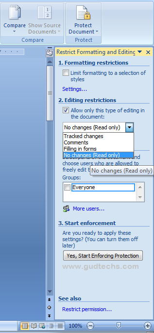 “Restrict Formatting and Editing” task pane open हो जाता है। अब आप task pane में सक्षम कुछ विकल्प देख सकते हैं। सूची में दूसरा option Editing restrictions से “Allow only this type of editing in the document” चेक बॉक्स को टीक करे। अब Drop Down List box से Comment या No changes (Read only) या अपने अनुसार option को सेलेक्ट करें।