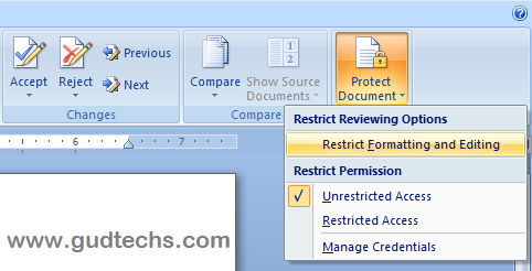 Document को Protect करने के लिए, Word 2007 में Review Tab का चयन करें। इस टैब में, Protect Group से Protect Document का चयन करें।