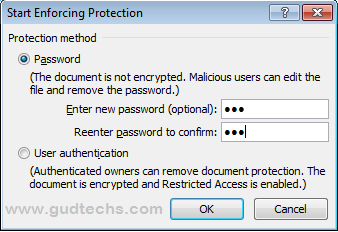 वैकल्पिक रूप से आप असाधारण मेनू में उपयोगकर्ता नाम के आधार पर Document के लिए पूर्ण अनुमति दे सकते हैं। अब सबसे नीचे “Yes, Start Enforcing Protection” बटन पर क्लिक करें। इस बटन पर क्लिक करते ही Start Enforcing Protection डायलॉग बॉक्स खुल जाता है ।